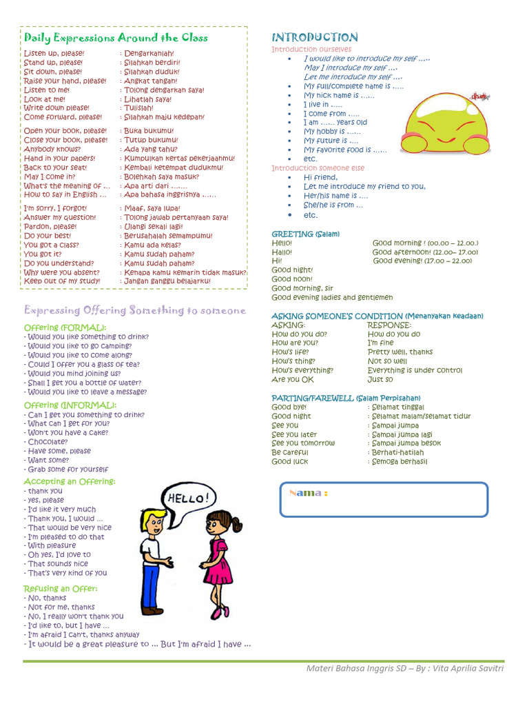 Materi Introducing Oneself and Others, Contoh Dialog, dan ... from 1.bp.blogspot.com English (82) grammar (30) kinds of text (20) expression (17) vocabulary (16) bahasa inggris (14) kurikulum 2013 (10) descriptive text (7) materi bahasa inggris (7) kelas 7 (6) #keharusan_larangan_dan_himbauan_dalam_bahasa_inggris (5) apologizing (5) contoh tugas portofolio (5) contoh tugas proyek (5) kelas 7 smp (5) pendidikan (5) semester 1 (5. Unfortunately, mother gothel, the owner of the garden, caught him doing it. Teks lisan dan tulis untuk mengucapkan dan merespons ajakan melakukan suatu tindakan fungsi sosial menjaga hubungan interpersonal dengan guru, teman, dan orang lain struktur teks andi: Semoga materi bahasa inggris kelas x sma dan smk kurikulum 2013 semester 1 dan 2 dalam bentuk pdf ini dapat bermanfaat untuk membantu siswa maupun guru dalam kegiatan belajar mengajar. Soal latihan bahasa inggris akhir semester kelas 10. Soal essay bahasa inggris dan jawabannya untuk kelas x semester 2 pada tulisan ini masih berisikan materi yang dengan contoh soal pilihan ganda pertama b. Sobat butuh penjelasan lebih unik mengenai procedure text, silahkah baca tulisan ini dengan terlebih dahulu berdo'a, semoga apa yang saya pelajari bisa membuat saya bisa. When they do the same to you, you also respond to them.